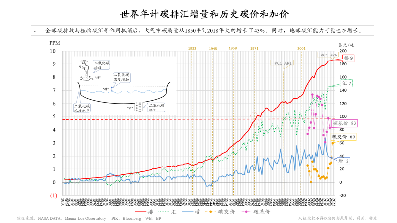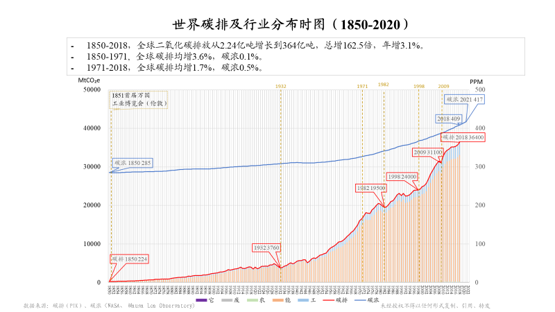 另外,我有兩張圖跟大家分享一下,也是和這個(gè)題目相關(guān)的。這張圖上面藍(lán)線是對(duì)我們環(huán)境長(zhǎng)期的一個(gè)觀測(cè),二氧化碳濃度水平。在夏威夷的莫納羅亞島,從1958年開始有持續(xù)性的觀測(cè),在此之前通過(guò)南極冰雪的資料,可以一直追溯到1850年(285PPM)。很有意思1851年全世界第一次工業(yè)博覽會(huì)在倫敦召開,也是一個(gè)工業(yè)時(shí)代到來(lái)的標(biāo)志。經(jīng)過(guò)這么長(zhǎng)時(shí)間的工業(yè)革命,現(xiàn)在可以看到二氧化碳水平已經(jīng)達(dá)到417PPM。底下這條紅線,是我們自工業(yè)革命以來(lái)的全球碳排放,可以看出明顯增速加快。