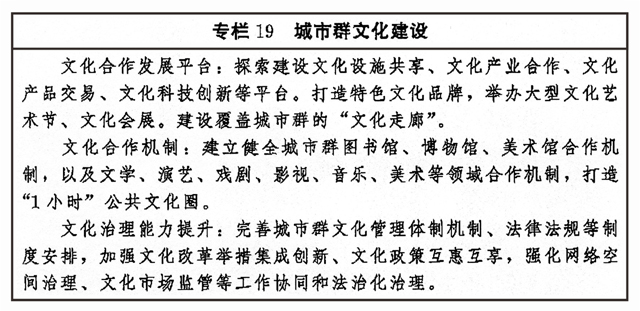 加強(qiáng)區(qū)域文化協(xié)同創(chuàng)新,健全合作互助、扶持補(bǔ)償機(jī)制,推動?xùn)|部地區(qū)以創(chuàng)新引領(lǐng)文化發(fā)展,加大力度支持中西部地區(qū)以及東北等老工業(yè)基地文化發(fā)展,扶持革命老區(qū)、民族地區(qū)、邊疆地區(qū)文化發(fā)展,形成相互促進(jìn)、優(yōu)勢互補(bǔ)、融合互動的區(qū)域文化發(fā)展格局。圍繞京津冀協(xié)同發(fā)展、長江經(jīng)濟(jì)帶發(fā)展、粵港澳大灣區(qū)建設(shè)、長三角一體化發(fā)展、黃河流域生態(tài)保護(hù)和高質(zhì)量發(fā)展等區(qū)域重大戰(zhàn)略,健全推進(jìn)區(qū)域內(nèi)文化協(xié)同發(fā)展機(jī)制,提升公共文化設(shè)施互聯(lián)互通水平,加強(qiáng)區(qū)域文化產(chǎn)業(yè)帶建設(shè),實(shí)現(xiàn)區(qū)域文化建設(shè)水平整體提高。促進(jìn)形成文化產(chǎn)業(yè)發(fā)展新格局,創(chuàng)新城市群文化一體化發(fā)展體制機(jī)制,共建高水平合作平臺,加強(qiáng)公共文化服務(wù)便利共享。完善以城帶鄉(xiāng)、城鄉(xiāng)融合的文化發(fā)展體制機(jī)制,發(fā)揮城市帶動輻射作用,加快城鄉(xiāng)間文化要素雙向流動,形成以點(diǎn)帶面、特色鮮明、優(yōu)勢互補(bǔ)、均衡配置的城鄉(xiāng)文化發(fā)展新格局。