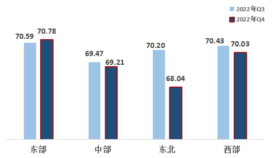 2、西部地區(qū)超越中部、東北地區(qū)。東部、西部、中部、東北地區(qū)指數(shù)分別為70.78、70.03、69.21、68.04。東部地區(qū)領(lǐng)先,西部地區(qū)超越中部地區(qū)排名第二,東北地區(qū)最后。自2022年第一季度以來,西部地區(qū)連續(xù)三個季度超越中部地區(qū)。與上一季度相比,東部地區(qū)有所增長,中部、東北、西部地區(qū)下滑,東北地區(qū)指數(shù)降幅較大。
