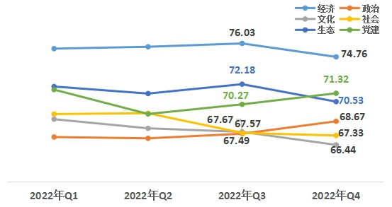 1、從領(lǐng)域來看,政治、黨建領(lǐng)域升幅高于其他領(lǐng)域。第四季度,經(jīng)濟(jì)領(lǐng)域74.76,政治領(lǐng)域68.67,文化領(lǐng)域66.44,社會領(lǐng)域67.33,生態(tài)領(lǐng)域70.53,黨建領(lǐng)域71.32。與上一季度相比,政治、黨建領(lǐng)域均有上升,經(jīng)濟(jì)、文化、社會、生態(tài)領(lǐng)域下降,生態(tài)領(lǐng)域降幅較大。