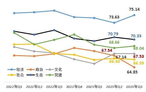 從改革熱度指數(shù)的六大領(lǐng)域來(lái)看,經(jīng)濟(jì)領(lǐng)域75.14,政治領(lǐng)域64.85,文化領(lǐng)域67.53,社會(huì)領(lǐng)域66.39,生態(tài)領(lǐng)域70.33,黨建領(lǐng)域69.04。與上一季度相比,經(jīng)濟(jì)、黨建領(lǐng)域上升。