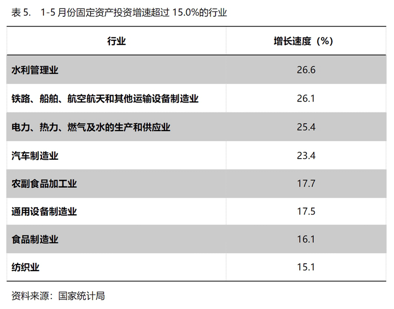 1-5月份,固定資產(chǎn)投資增速超過15%的主要行業(yè)共8個,即水利管理業(yè)增長26.6%,鐵路、船舶、航空航天和其他運輸設備制造業(yè)增長26.1%,電力、熱力、燃氣及水的生產(chǎn)和供應業(yè)增長25.4%,汽車制造業(yè)增長23.4%,農(nóng)副食品加工業(yè)增長17.7%,通用設備制造業(yè)增長17.5%,食品制造業(yè)增長16.1%,紡織業(yè)增長15.1%。