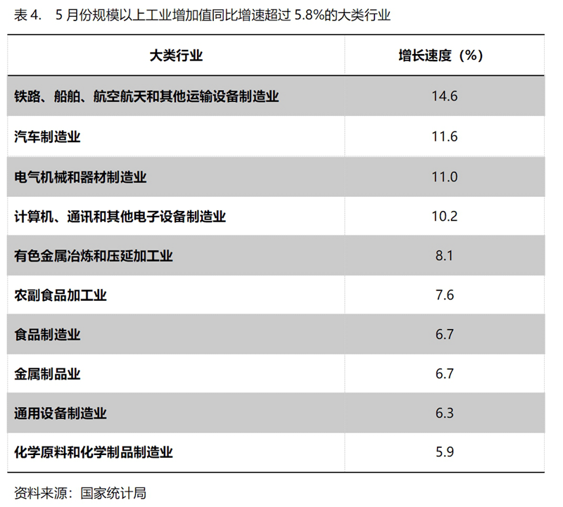 5月份,增長速度超過規(guī)模以上工業(yè)增長5.8%的主要大類行業(yè)共有10個,即鐵路、船舶、航空航天和其他運輸設備制造業(yè)增長14.6%,汽車制造業(yè)增長11.6%,電氣機械和器材制造業(yè)增長11.0%,計算機、通訊和其他電子設備制造業(yè)增長10.2%,有色金屬冶煉和壓延加工業(yè)增長8.1%,農(nóng)副食品加工業(yè)增長7.6%,食品制造業(yè)增長6.7%,金屬制品業(yè)增長6.7%,通用設備制造業(yè)增長6.3%,化學原料和化學制品制造業(yè)增長5.9%。