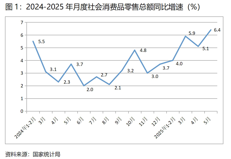 (一)零售增速由落轉升。5月份,社會消費品零售總額同比增長6.4%,比4月份增長5.1%回升了1.3個百分點,4月份比3月份增長5.8%回落了0.7個百分點,社會消費品零售總額增速由上月回落轉為回升,為上年以來月度同比增速最快的月份。這是近一個時期特別是今年以來持續(xù)采取以舊換新等一系列擴大消費政策措施的結果,同時也說明只要采取積極有效的政策措施,是能夠取得一些領域持續(xù)回升的效果。