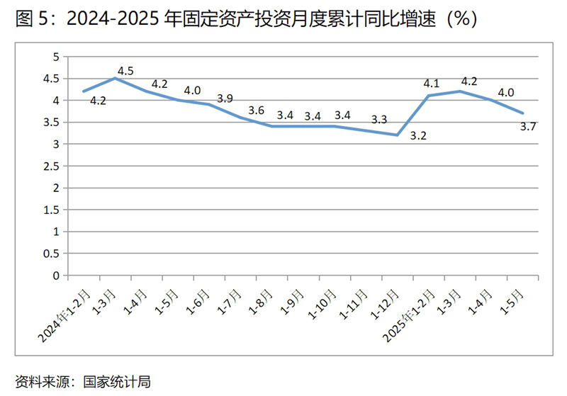 (四)工業(yè)增速持續(xù)回落。5月份,規(guī)模以上工業(yè)增加值同比增長5.8%,比上月增長6.1%回落了0.3個百分點,4月份比3月份回落了1.6個百分點,呈現(xiàn)出兩個月的連續(xù)回落。從工業(yè)三大門類看,主要是制造業(yè)增速回落。5月份采礦業(yè)同比增長5.7%,與上月持平;制造業(yè)增長6.2%,比上月回落0.4個百分點;電力、熱力、燃氣及水生產(chǎn)和供應業(yè)增長2.2%,比上月回升0.1個百分點。5月份工業(yè)增速回落幅度雖然比上月收窄不少,但還是要密切關注回落背后反映出的工業(yè)增長動力未來可能變動的趨勢。