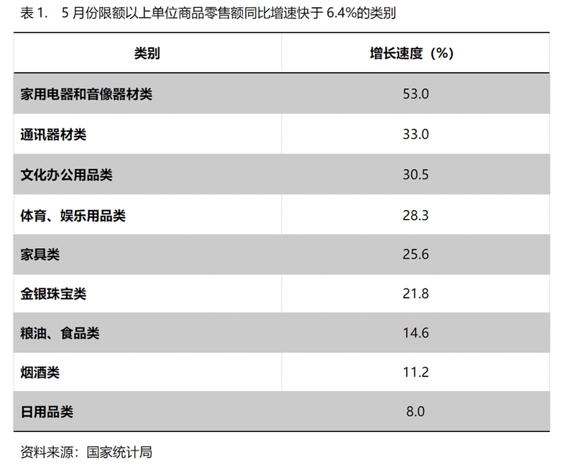 5月份,限額以上單位商品零售額增速快于社會消費品零售總額6.4%增速的共有9類,即家用電器和音像器材類增長53.0%,通訊器材類增長33.0%,文化辦公用品類增長30.5%,體育、娛樂用品類增長28.3%,家具類增長25.6%,金銀珠寶類增長21.8%,糧油、食品類增長14.6%,煙酒類增長11.2%,日用品類增長8.0%。