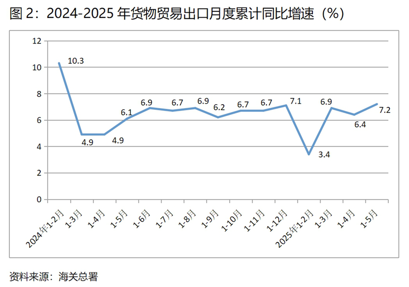 (二)貨物出口增速由落轉升。1-5月份,貨物出口同比增長7.2%,比1-4月份增長6.4%回升0.8個百分點,1-4月份比1-3月份回落0.5個百分點,增速呈現(xiàn)出由落轉升的態(tài)勢。貨物出口對主要貿(mào)易出口經(jīng)濟體增速有升有落,1-5月份對歐盟出口同比增長7.7%,比1-4月份4.9%增速回升2.8個百分點;對美國出口下降8.7%,比1-4月份下降2.5%擴大6.2個百分點;對東盟出口增長13.5%,比1-4月份11.5%增速回升2.0個百分點;對拉丁美洲出口增長10.6%,比1-4月份11.5%增速回落0.9個百分點。盡管5月12日中美發(fā)表聯(lián)合公報同意在90天內(nèi)暫時調降“對等關稅”中的稅率,但我國對美出口降幅仍出現(xiàn)進一步擴大的趨勢,與整個出口增長加快形成了明顯反差,說明中美貿(mào)易關系的復雜性和較大的不確定性。