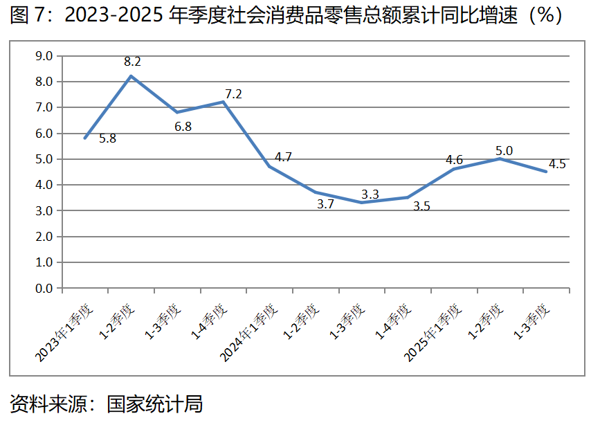 圖7:2023-2025年季度社會消費品零售總額累計同比增速(%)