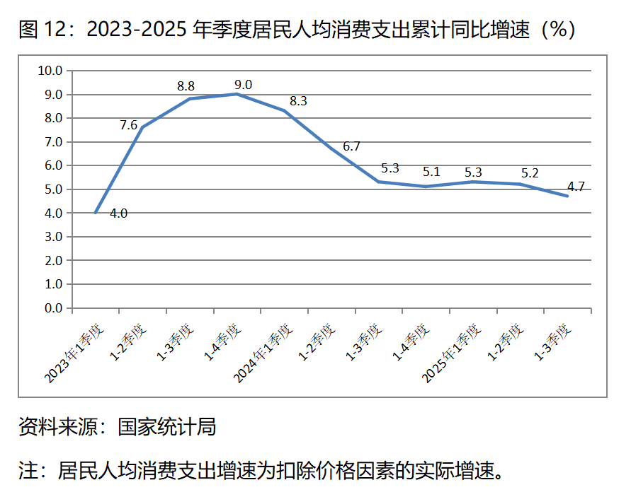 圖12:2023-2025年季度居民人均消費支出累計同比增速(%)