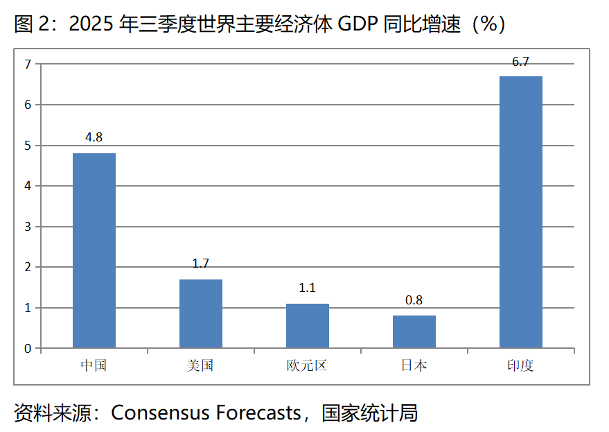 圖2:2025年三季度世界主要經(jīng)濟體GDP同比增速(%)
