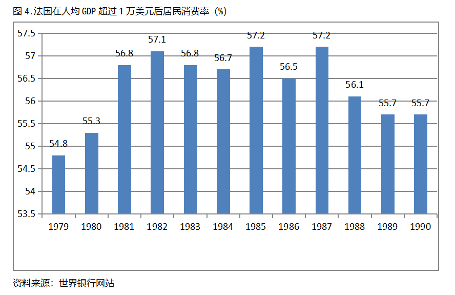 美國在人均GDP超過1萬美元后的12年期間注,居民消費率一直保持在60.0%以上,同時還呈現(xiàn)出總體持續(xù)提高的趨勢。美國在1978年人均GDP超過1萬美元,當年居民消費率為60.5%,此后總體保持了持續(xù)提高的態(tài)勢,12年后的1989年提高到63.4%,提高了2.9個百分點。