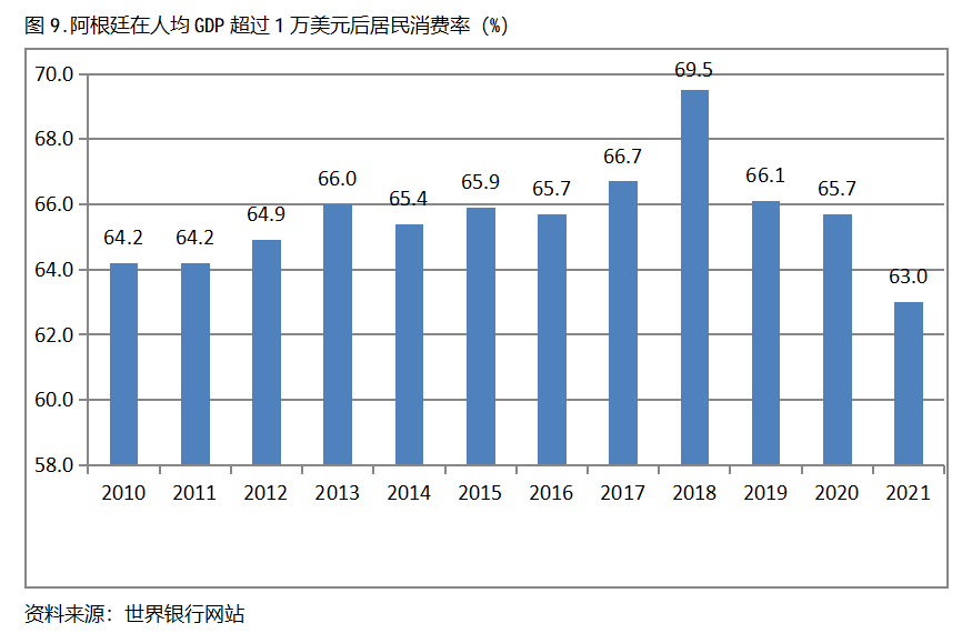 阿根廷在人均GDP超過1萬美元后的12年期間,居民消費率基本上保持在63.0%以上,也呈現(xiàn)出較長時間的提高,但后幾年也出現(xiàn)小幅的回落。阿根廷在2010年人均GDP超過1萬美元,當年居民消費率為64.2%,2018提高到69.5%,隨后兩年出現(xiàn)回落,2021年為63.0%,也就是說,阿根廷在人均GDP超過1萬美元后的12年期間,居民消費率由當年的64.2%提高到2018年最高的69.5%,共提高了5.3個百分點。
