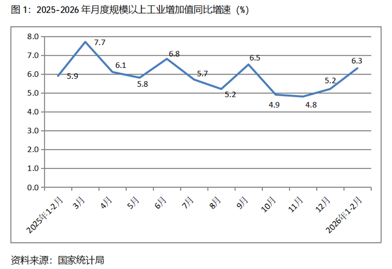 一、工業(yè)增速持續(xù)回升。1-2月份,規(guī)模以上工業(yè)增加值同比增長6.3%,比上年12月份增長5.2%回升了1.1個百分點,上年12月份比上年11月份增長4.8%回升了0.4個百分點。從工業(yè)三大門類看,采礦業(yè)、制造業(yè)和電力、熱力、燃氣及水生產(chǎn)和供應(yīng)業(yè)增速比上年12月份全面回升,1-2月份,采礦業(yè)同比增長6.1%,比上年12月份增長5.6%回升0.5個百分點;制造業(yè)增長6.6%,比上年12月份增長6.4%回升0.2個百分點;電力、熱力、燃氣及水生產(chǎn)和供應(yīng)業(yè)增長4.7%,比上年12月份增長2.3回升2.4個百分點。