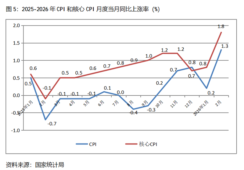 五、CPI漲幅由落轉(zhuǎn)升。2月份,CPI同比上漲1.3%,比1月份上漲0.2%回升了1.1個百分點,1月份漲幅比上年12月份回落0.6個百分點;核心CPI同比上漲1.8%,比1月份上漲0.8%回升1.0個百分點,1月份漲幅比上年12月份回升0.1個百分點。由于上年2月份CPI下降0.7%、基數(shù)較低,今年和上年2月份CPI兩年平均僅上漲0.3%,CPI漲幅是否將走出低速運行的態(tài)勢,還有待進一步的觀察。