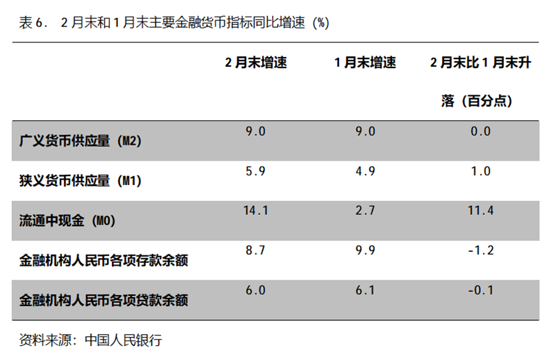 六、M2增速由升轉(zhuǎn)平。2月末,廣義貨幣供應(yīng)量(M2)同比增長9.0%,與1月份末增長9.0%持平,1月末增幅比上年末增長8.5%回升0.5個百分點;狹義貨幣供應(yīng)量(M1)同比增長5.9%,比1月末增長4.9%回升1.0個百分點,1月末增幅比上年末增長3.8%回升1.1個百分點;流通中貨幣(M0)同比增長14.1%,比1月末增長2.7%回升11.4個百分點,1月末增幅比上年末增長10.2%回落7.5個百分點。2月末,雖然M2增速與M1增速差距進一步縮小,但仍還保持著不小的差距。