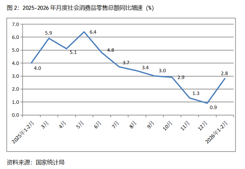 二、零售增速由落轉(zhuǎn)升。1-2月份,社會消費品零售總額同比增長2.8%,比上年12月份增長0.9%回升了1.9個百分點,上年12月份比上年11月份增長1.3%回落了0.4個百分點,其中,餐飲收入和商品零售額增速均出現(xiàn)了回升,1-2月份餐飲收入同比增長4.8%,比上年12月份增長2.2%回升了2.6個百分點;商品零售額增長2.5%,比上年12月份增長0.7%回升1.8個百分點。連續(xù)幾個月增速回落的社會消費品零售總額增速出現(xiàn)了積極回升的苗頭。